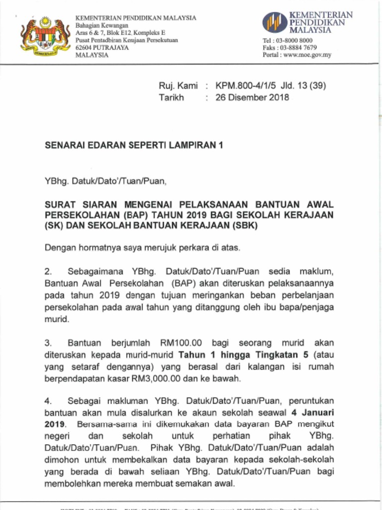 Bantuan ini diberikan kepada murid-murid Tahun 1 hingga Tingkatan 5 atau yang setaraf dengannya dari kalangan keluarga yang berpendapatan Isi Rumah Kasar RM300000. Bantuan awal Rm 10000 bagi murid-murid di sekolah bagi tahun 2019. Muat turun Surat Siaran Mengenai Pelaksanaan Bantuan Awal Persekolahan BAP Tahun 2019 bagi Sekolah Kerajaan SK dan Sekolah Bantuan Kerajaan SBK di SINI.